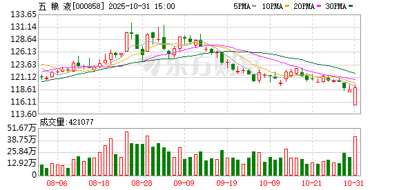 10月31日,五粮液一度跌超2%,随后拉升转红,收盘涨0.44%。
